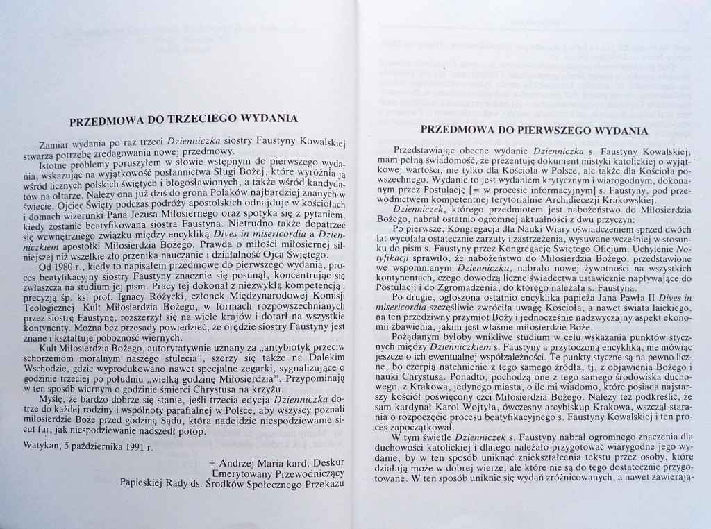 Dzienniczek błogosławionej siostry M. Faustyny Kowalskiej na temat jej objawień. Przedmowa została napisana przez Andrzeja Marię kardynała Deskura.